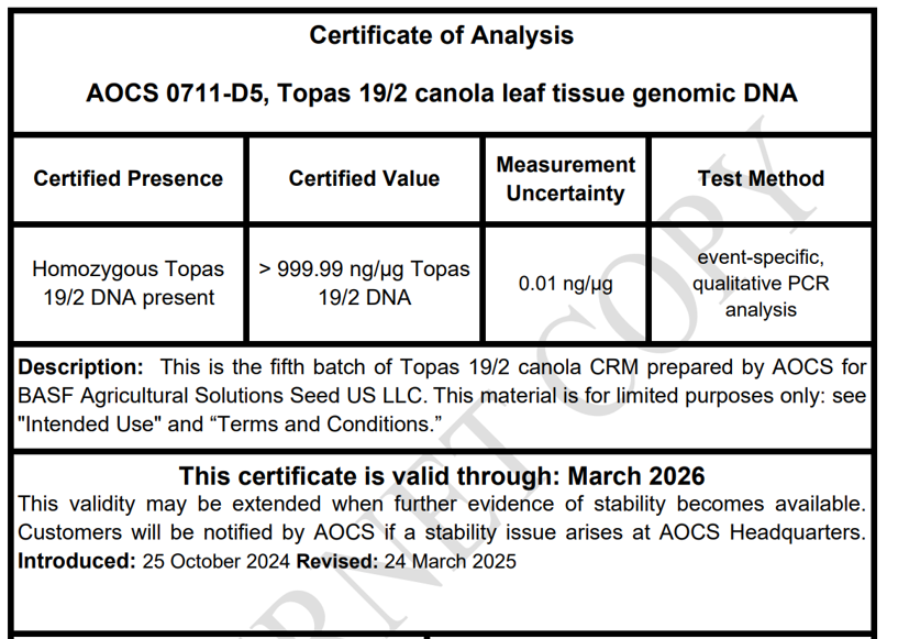 AOCS 0711-D5是AOCS技术服务公司2020年生产的菜籽油CRM AOCS 0711-D5的制备和认证。CRM是根据ISO 17034:2016制备的,旨在作为第三方测试油菜籽转化事件的对照材料,而不是用于其他目的。爱荷华州费尔菲尔德Food Chain ID(ISO 17025认证实验室)使用事件特异性定性PCR分析验证了Topas 19/2油菜籽的纯度。AOCS 0711-D5有0.5毫升带踢脚线的螺旋盖自封管。Topas 19/2卡诺拉DNA由巴斯夫农业解决方案种子美国有限责任公司从干净的叶子中提取。叶子DNA提取样品应存放在+4°C的自封管中,置于黑暗中。转基因油菜Topas 19/2叶子基因组DNA标准品