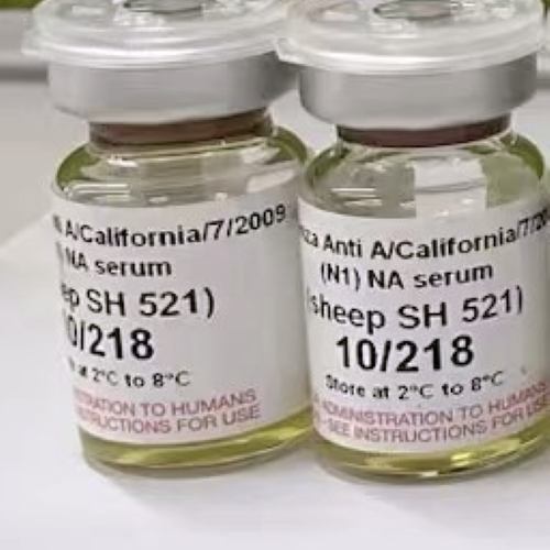 生物材料的原产国:英国。在绵羊(SH 521)中制备了针对NIBRG-127(H7N1)病毒的抗血清。NIBRG-127是NIBSC开发的重组体,具有来自a/Prague/56(H7N7)的HA基因、来自a/California/7/2009(H1N1)的NA基因和来自a/PR/8/34(H1N1)中的六个内部基因。肌肉注射一剂约10微克的纯化病毒和弗氏完全佐剂(FCA)。两周后,再次服用约10微克的弗氏不完全佐剂(FIA)。随后,每周再服用三剂10微克的FIA。初次免疫六周后,收集血清并加入叠氮化钠(0.05%w/v)。然后用动植物检疫局批准的灭活口蹄疫病毒的方法处理血清,然后用含有叠氮化钠(0.05%w/v)的PBS缓冲液以2:1稀释,并装入1ml体积的小瓶中。