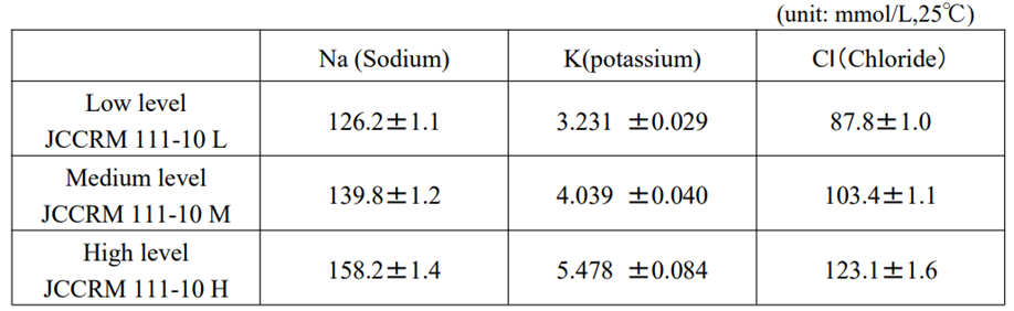 本CRM是根据日本临床化学学会血气/电解质专家委员会制定的“ISE认证主要参考物质的制备和测量方法”编制的。为了消除由液体结电位引起的误差,其pH值和碳酸氢根离子水平大多与从健康个体收集的样本相当(这是ISE参考材料不可或缺的一点)。此外,为了消除基于体积位移的误差因素,其血浆水质量浓度被调整为0.93,这在从健康个体收集的样本范围内(0.925-0.935kg/l)。