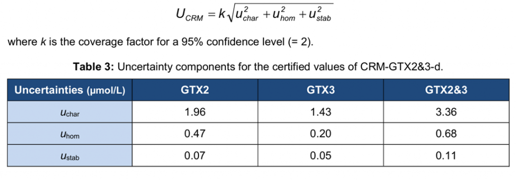 考虑并定量了与CRM-GTX2和3-d表征相关的所有合理误差来源。包括与所使用的两种分析方法相关的组合不确定度分量(uchar)。总体不确定度估计(UCRM)包括与批次表征(uchar)、储存过程中的不稳定性(ustab)和瓶间变化(uhom)相关的不确定性[8-11]。表3列出了这些组件,它们的组合和扩展如下: