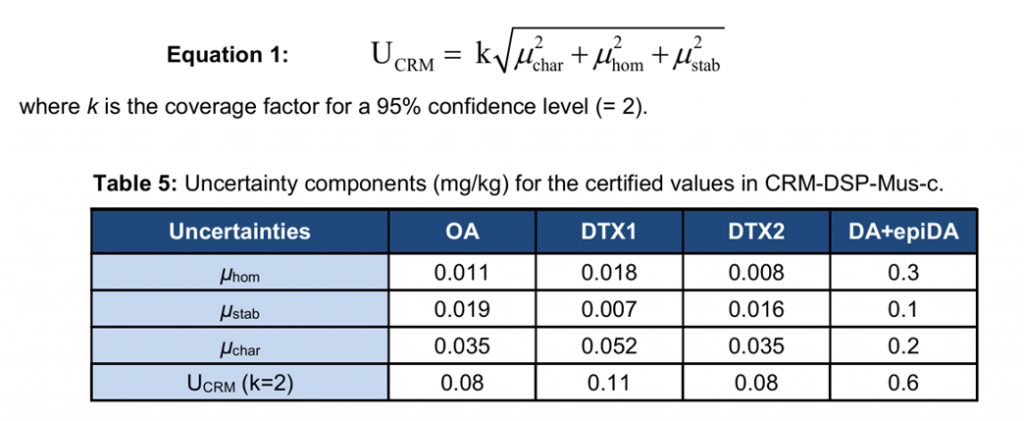 对CRM-DSP-Mus-c的反向等时研究表明,OA、DTX1和DTX2在-12°c、+4°c和+20°c下一年内具有良好的稳定性。在+40°C时观察到显著降解。该数据用于确定与长期稳定性相关的不确定性,以纳入最终的综合不确定性预算。DA在CRM-DSP-Mus-c中在-12°c下稳定1年,该数据用于确定与长期稳定性相关的不确定性。
