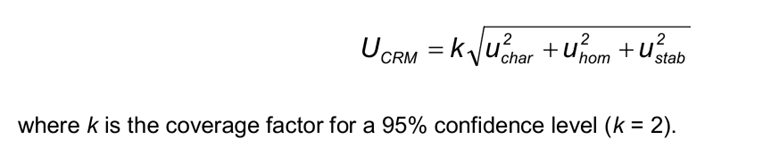 与CRM-FDMT1表征相关的所有不确定性的重要贡献在其他地方进行了全面描述[16]。总体不确定度估计(UCRM)包括与使用两种分析方法的批次表征(uchar)相关的不确定度,瓶间变化(uhom)和与长期储存相关的不确定性(ustab)[17]。表3列出了这些组件,它们的组合和扩展如下: