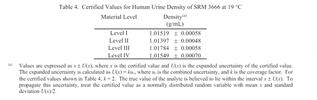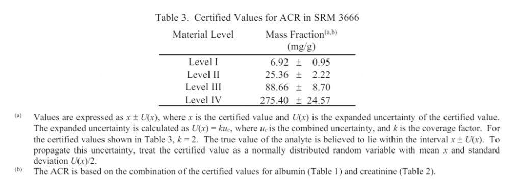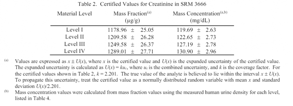 表2中提供的肌酸酐的认证质量分数和质量浓度值以及相关的不确定度是基于使用NIST同位素稀释液相色谱-质谱法(ID-LC-MS)参考测量程序对血清中肌酸酐进行修改所确定的分析结果获得的结果[4]。