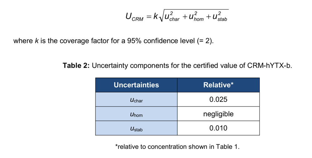 考虑并测量了与CRM-hYTX-b表征相关的所有合理误差来源。总体不确定性估计(UCRM)包括与批次表征(uchar)和储存过程中的不稳定性(ustab)相关的不确定性[6-8]。表2中列出了这些组件,它们的组合和扩展如下: