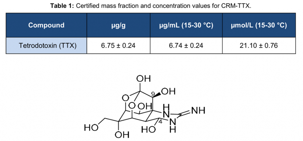 河豚毒素(TTX)是一种天然存在的毒素,与食用受污染的海洋物种(尤其是河豚)引起的中毒事件有关[1,2]。NRC CRM-TTX是TTX在1mM乙酸水溶液中的经认证的校准溶液。它被设计为一种仪器校准溶液,有助于TTX的识别和定量。