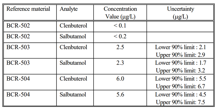 冻干牛尿基质中克伦特罗和沙丁胺醇标准物质报告–冻干牛尿基质中克伦特罗和沙丁胺醇考物质的制备和认证:BCR-502作为分析空白,来源于未经处理的小牛;BCR-503和BCR-504是从口服克伦特罗和沙丁胺醇的动物身上获得的真实物质。研究了材料的均匀性和稳定性,具体测试没有发现任何不均匀性或不稳定性。用于认证重构尿液样本中克伦特罗和沙丁胺醇物质浓度的分析方法均基于质谱。重组参考样品中克伦特罗和沙丁胺醇的以下物质浓度经过认证: