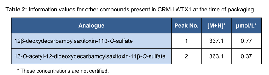 CRM-LWTX1含有少量的脱酰类似物,12β-脱氧脱羧酰基沙西毒素-11β-O-硫酸盐,以及一种在C12,13-O-乙酰基-12-脱氧脱羰基沙西毒素11β-O-硫酸酯处缺失氧的类似物。使用LC-MS以CRM-LWTX1作为校准物并假设等摩尔响应来估计它们的浓度(表2)。