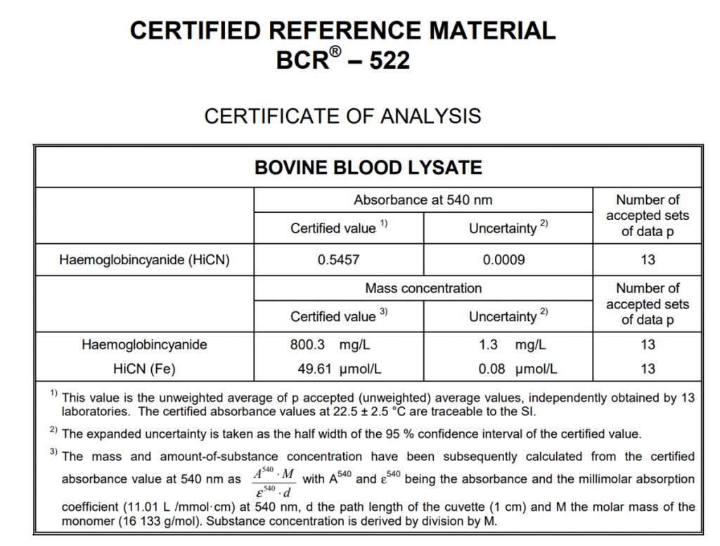 BCR-522样品描述 每个样品均为牛血裂解液形式,血红蛋白氰化物质量浓度约为800.3 mg/L,体积为10 mL。材料保存在密封的棕色中性硼硅玻璃安瓿中。已证明牛血红蛋白和人血红蛋白的摩尔质量和摩尔消光系数是相等的。