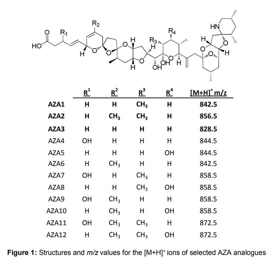 原多甲藻酸(AZAs)是一组同时含有羧基和胺官能团的海洋生物毒素(图1)。AZAs由小型甲藻Azadinium spinosum[1]产生,并已被证明在各种贝类物种中积累到高水平[2]。人类食用被AZAs污染的贝类会导致中毒,症状与腹泻性贝类中毒相似[3]。