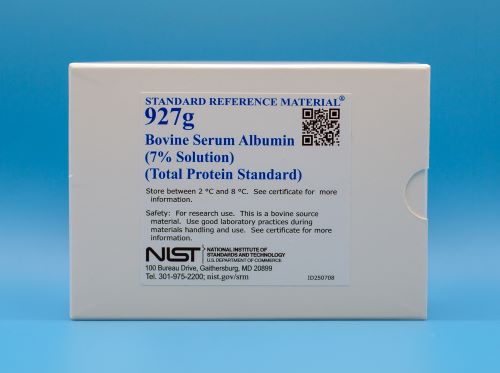 牛血清白蛋白标准物质(7%溶液)(总蛋白)参考值:表2中提供了使用缩二脲法测定的参考BSA浓度。使用SRM 927e作为外标,使用缩二脲参考方法[1]测定SRM 927f中的BSA浓度。参考值是未经认证的值,是基于可用数据对真实值的最佳估计;然而,这些值不符合NIST的认证标准,并且具有相关的不确定性,这些不确定性可能仅反映测量精度,可能不包括所有不确定性来源,或者可能反映多种分析方法之间缺乏足够的统计一致性[2]。表3中提供了其他性质的参考值,包括使用电喷雾电离质谱法测定的密度和相对平均分子质量。